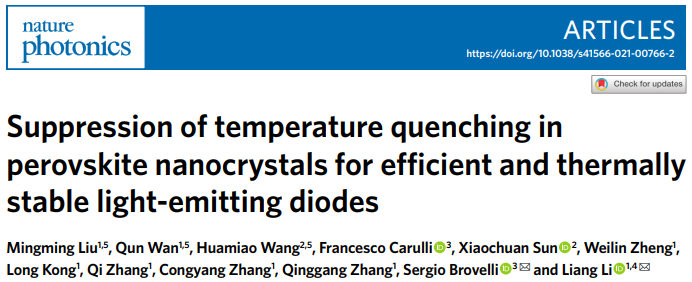 Recently, the research team led by Prof.Li Liang from School of Environmental Science and Engineering, SJTU published online a collaborative research paper entitled “Suppression of temperature quenching in perovskite nanocrystals for efficient and thermally stable light-emitting diodes” in Nature Photonics. In this paper, Prof. Li’s team reported a strategy to achieve near-zero “thermal quenching” of fluorescence in perovskite nanocrystals from room temperature to 100℃ through surface passivation on fluoride ion. The LED electroluminescent devices they prepared shows excellent resistance to “thermal quenching”.