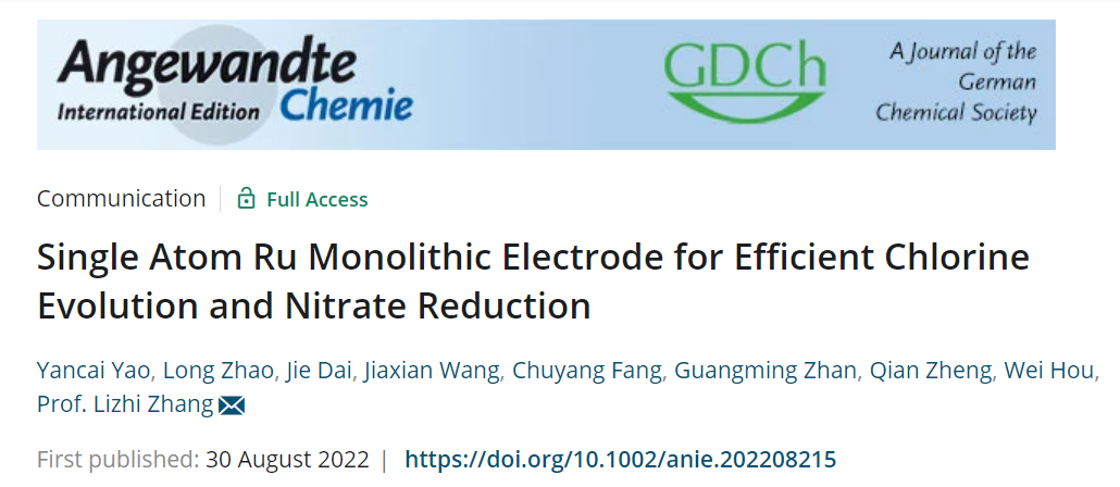 近日,厂长资源 张礼知教授团队在Angew. Chem.在线发表了研究论文Single Atom Ru Monolithic Electrode for Efficient Chlorine Evolution and Nitrate Reduction,厂长资源 长聘教轨助理教授么艳彩为该论文第一作者,特聘教授张礼知为通讯作者。