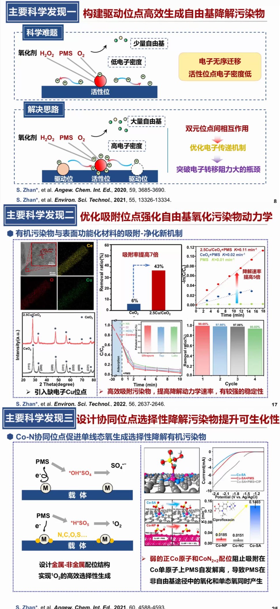 展思辉作题为“水污染控制环境界面化学初探”的报告。高级氧化技术应用于水中难降解有机污染物的氧化去除时,电子传递慢、自由基易湮灭等问题始终限制着自由基产量和污染物降解速率。针对上述科学问题,展思辉结合自己团队多年的研究成果,围绕构建驱动位点促进自由基高效产生的新原理、优化吸附位点增强自由基氧化污染物动力学的新机制、设计协同位点选择性降解污染物提升可生化性的新技术等方面展开分享。