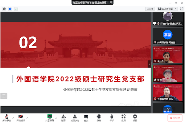 厂长资源 2022级硕士生党支部书记常崇轩和外国语学院2022级硕士生党支部书记胡云豪分别介绍了各自所在党支部构成、支部工作理念,以及围绕学习贯彻党的二十大精神开展的活动。