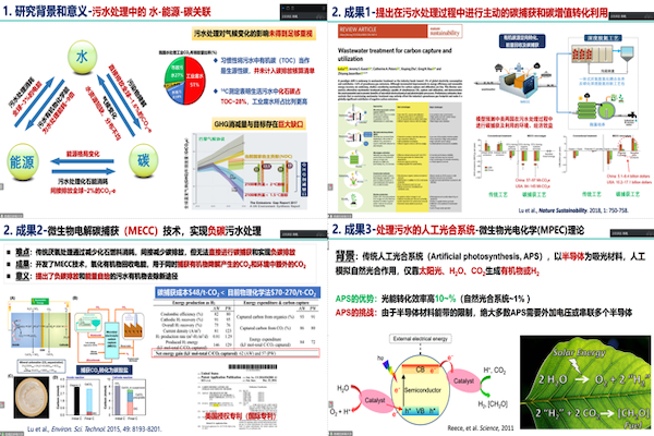能源化利用和碳捕获及碳增值转化是“双碳”背景下废水处理研究的热点和发展方向。针对目前废水处理行业能耗高、直接和间接碳排放量大的问题,路璐教授及其课题组基于对合成生物学、生物电化学和光电化学的交叉融合,提出多种微生物-材料杂合界面理论及解析界面电子传递机制,构建了不同尺度的反应系统,在处理有机废水过程中回收有机物化学能,并结合其他可再生能源(如太阳能),共同驱动转化CO2、废弃有机碳、重金属等多种污染物为高价值含化合物,实现同步治污和碳减排及碳增值转化。同时在城市尺度,对废水处理工业厂-网-河的碳排放量进行实际监测和核算,在获取的碳排放格局基础上,提出废水处理行业在“双碳”目标约束下的最优资源化路径,从“人工光合作用APS-微生物光电化学MPEC技术处理污水”、“废水重金属有机碳绿色生物合成”、“污泥资源化利用协同CO2还原”、“展望及工程运用前景”等四个方面展开成果分享。