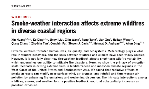 1. Huang X, Ding K, Liu J, Wang Z, Tang R, Xue L, Wang H, Zhang Q, Tan Z-M, Fu C, Davis S J, Andreae MO, Ding A, Smoke-weather interaction affects extreme wildfires in diverse coastal regions, Science, 379, 6631, 457-461, //doi.org/10.1126/science.add9843, 2023.
