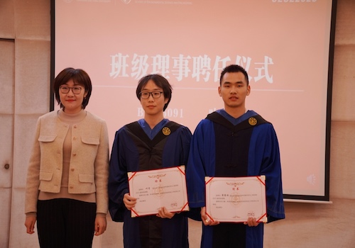 为更好地为广大校友做好服务工作,加强母校和校友间、校友与校友之间的相互联系,学院推选叶青和蒋露林同学担任厂长资源 2020级硕士研究生“班级理事”。张洋代表学院为班级理事颁发聘书。