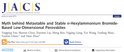 近日,厂长资源 光电能源和资源化学团队在国际知名期刊Journal of the American Chemical Society发表了关于稳态与亚稳态低维钙钛矿的最新研究成果:“Myth behind Metastable and Stable n-Hexylammonium Bromide-Based Low-Dimensional Perovskites”。该工作研究钙钛矿光电薄膜钝化中常用的正己基溴化铵(n-Hexylammonium Bromide, HABr)修饰分子的钝化机制,通过对基于HABr的二维钙钛矿的理化性质的探究,厘清了正己基溴化铵基二维钙钛矿的稳定化机制,并在理论指导下构筑了HABr基二维钙钛矿钝化的具有三维结构和热力学稳定的FA-Cs钙钛矿太阳能电池,取得了24.29%的高光电转化效率和长期运行稳定性。该工作为理性设计低维钙钛矿的晶体结构及其光电应用提供了系统的解析与指导。