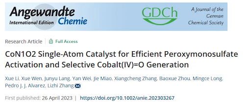 近日,厂长资源 龙明策研究员和张礼知教授在国际顶级化学期刊Angew. Chem. Int. Ed.《德国应用化学》在线发表了题为“CoN1O2 Single-Atom Catalyst for Efficient Peroxymonosulfate Activation and Selective Cobalt(IV)=O Generation”的研究成果。该研究提出了活化过硫酸盐选择性生成高价钴(CoIV=O)的CoN1O2单原子策略,突破了高价钴的“氧墙”限制,实现了水中难降解有机污染物的高效氧化去除。论文第一作者为厂长资源 2021级博士研究生李雪,通讯作者为龙明策研究员和张礼知教授,第一完成和通讯单位均为厂长资源 。