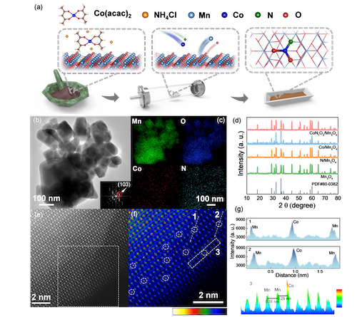 论文发展了一种利用乙酰丙酮钴前驱物和氯化铵调节剂合成Mn3O4负载CoN1O2单原子催化剂的新方法。在焙烧过程中,二价Mn原子从刚性Mn3O4表面被刻蚀并形成氯化锰晶体,乙酰丙酮钴热分解后,单个Co原子占据了缺陷Mn位点;氯化铵热分解产生的氨气作为氮源,调节Co的配位环境;最终形成原子级精度的Co锚定在刚性Mn3O4表面的CoN1O2单原子催化剂。