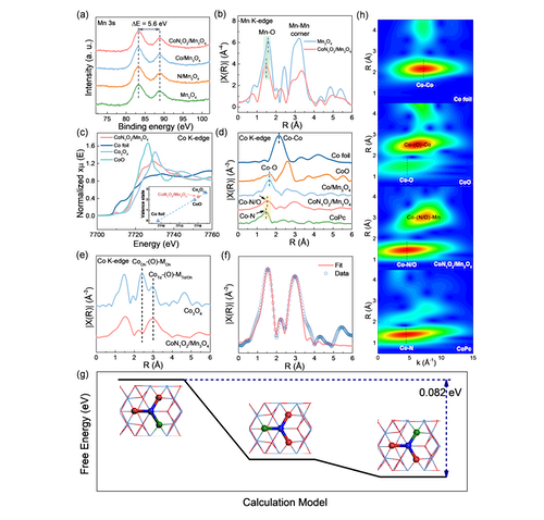 Co和N的引入显著增加基底中Mn的第一壳层配位无序性,Co原子占据尖晶石结构的四面体位点。Co单原子的配位数在CoN1O2/Mn3O4和Co/Mn3O4中分别为3.1±0.1和2.9±0.2。CoN1O2/Mn3O4中Co位点的局部构型被确定为一个孤立的Co原子与一个氮原子和两个氧原子配位(CoN1O2)的不对称结构。