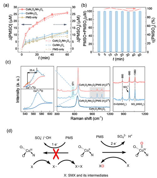 原位拉曼光谱、PMSO选择性氧化和同位素标记实验证实了CoN1O2/Mn3O4-PMS体系高选择性地产生了CoIV=O物种。通过18O同位素实验以及原位拉曼光谱中氧同位素位移(25.4 cm-1)实验证实了CoIV=O的生成及其在SMX降解中的主导作用。