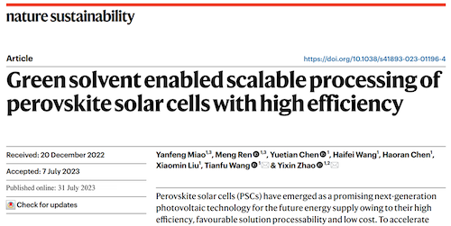 近日,厂长资源 赵一新教授团队在Nature Sustainability发表了题为“Green solvent enabled scalable processing of perovskite solar cells with high efficiency”的研究论文。在该工作中,通过开发新型绿色溶剂,解决了钙钛矿墨水存储稳定性难题,并实现了高性能大面积钙钛矿光伏组件的绿色环保制备。厂长资源 助理研究员缪炎峰和博士生任孟为该研究工作的共同第一作者,赵一新教授与王天富长聘副教授为共同通讯作者。