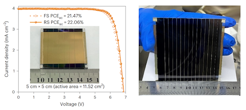 为解决上述问题,赵一新团队报道了一种基于绿色溶剂制备大面积钙钛矿薄膜及组件的方法。团队发现,使用可以由生物质合成的绿色γ-戊内酯(GVL)作为溶剂能大幅度提升钙钛矿墨水的存储稳定性(超过一年)。溶液化学研究表明,GVL和FA+阳离子具有更强的氢键作用,因此能够显著提高FA+阳离子的稳定性,并扩展了薄膜制备的操作窗口,从而能够通过反溶剂浴对大面积钙钛矿薄膜的结晶过程进行有效调控。基于该工艺的FAPbI3钙钛矿太阳能电池的效率达到了25.09%。这种方法还帮助实现了5cm × 5cm和10cm × 10cm光伏组件的可控制备,并获得了国际领先的22.06%和20.46%的活性面积效率。值得注意的是,此项工作中所用的溶剂GVL和反溶剂乙酸丁酯都是可作为食品添加剂的无毒溶剂,并且GVL可通过生物质合成获得,因此该绿色溶液体系解决了钙钛矿太阳能电池制造过程的安全环保难题。