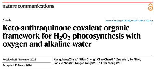 近日,厂长资源 龙明策研究员和张礼知教授在自然•通讯《Nat. Commun.》在线发表了题为“Keto-anthraquinone covalent organic framework for H2O2 photosynthesis with oxygen and alkaline water”的研究成果。该研究报道了酮式蒽醌共价有机框架材料的机械化学合成新方法,运用酮式蒽醌结构同步促进水氧化和氧还原,突破水分子难解离瓶颈问题,实现分子氧和碱性水高效光合成双氧水。论文第一作者为厂长资源 博士后张向成,通讯作者为龙明策研究员和张礼知教授,第一完成和通讯单位均为厂长资源 。