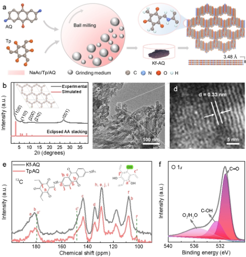 以2,6-二氨基蒽醌(AQ)和2,4,6-三甲酰基间苯三酚(Tp)为聚合单体,醋酸钠为催化剂,采用机械化学法合成了Kf-AQ。该催化剂具有良好的结晶性,且13C核磁谱和XPS O1s数据证明了层状结构酮式蒽醌共价有机框架的成功合成(图1)。