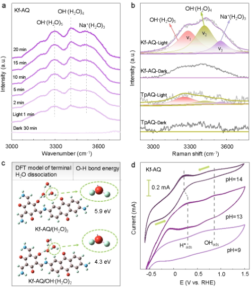 当pH=13时,Kf-AQ表面吸附了不同结构的水团簇(OH-(H2O)n)。酮式结构有助于水团簇的吸附,OH-离解结构进一步降低水分子摘氢能垒,加速水中摘氢和双氧水合成。Kf-AQ的CV曲线显示水解离形成活性氢,进一步确认酮式蒽醌结构促进水氧化摘氢。