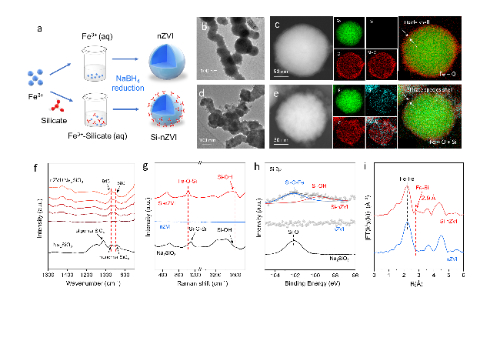 本研究利用液相修饰的方法制备了Si-nZVI。多种电镜、光谱及同步辐射表征证明,硅酸根以硅酸单体的形式修饰在零价铁表面。