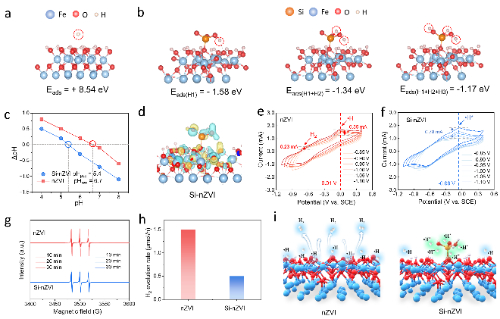 理论计算证明,硅酸根对质子具有强吸附作用,零电点测试结果证实,Si-nZVI通过吸附和富集质子,从而具有更高的表面酸度。差分电荷结果表明,Si-nZVI吸附质子后,临近Fe原子的电子具有转移至限域质子上的趋势。电化学伏安曲线结果显示,Si-nZVI表面H2的氧化峰消失,而归属于•H*的氧化峰显著增强,说明Si-nZVI能将更多•H限域在其表面,同时抑制了析氢反应。游离•H的EPR信号测试和析氢实验均验证了上述结果。