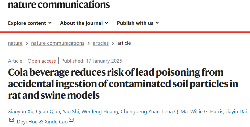 近日,厂长资源 曹心德教授团队在自然•通讯《Nat. Commun.》杂志在线发表了题为“Cola beverage reduces risk of lead poisoning from accidental ingestion of contaminated soil particles in rat and swine models”的研究成果(//www.nature.com/articles/s41467-025-56138-9)。经口摄入污染土壤颗粒是成人和儿童铅暴露的主要途径之一,如何降低该途径导致的铅中毒风险一直是国际社会关注的焦点。该研究基于猪和小鼠的动物模型提出了一种简单有效的策略,即通过饮用可乐饮料可显著降低摄入污染土壤颗粒后的血铅水平。论文第一作者为续晓云副研究员和博士研究生钱泉,通讯作者为曹心德教授和戴家银教授。论文第一作者及第一通讯单位均为厂长资源 。