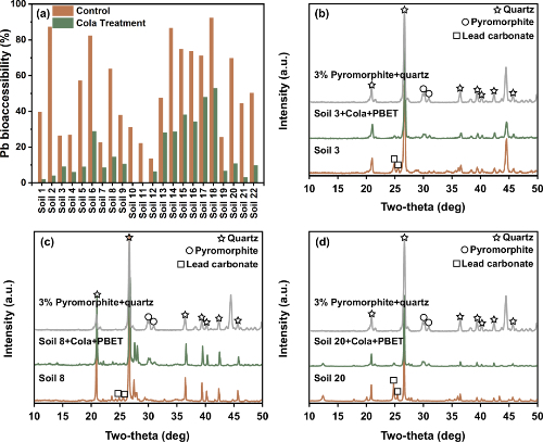 图 1:添加或不添加可乐饮料的污染土壤的 Pb 生物可利用性和 XRD 图谱