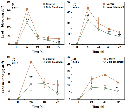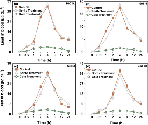 本研究基于体外胃肠模拟和动物模型,发现可乐饮料可降低摄入铅污染土壤颗粒后的血铅水平,成为一种简单有效的降低铅中毒风险的策略。该方法能促使污染土壤中的铅直接通过消化系统排出,从而不被吸收进入血液循环。研究结果显示,可乐能使22种污染土壤中的铅生物可利用性降低32.6% - 98.8%(图1)。在接触铅污染土壤的雄性大鼠和猪中,可乐处理分别使血铅浓度降低32.9% - 96.0%和31.5% - 81.5%(图2、3)。可乐之所以能降低铅的生物利用性,是因为其在消化阶段促进了不溶性磷酸铅沉淀的形成(图4)。这种沉淀可直接通过粪便排出,从而降低了血液对铅的吸收。这些发现表明,饮用可乐可降低意外摄入污染土壤后铅中毒的风险。然而,由于缺乏基于人群的研究,该方法对人体的适用性仍不确定。上述研究结果表明,尽管饮用可乐在动物模型中具有减少摄入土壤后铅吸收的潜力,但在将其作为一种治疗方案应用前,还需进一步探明其在人体中的安全性、有效性以及可能存在的风险。