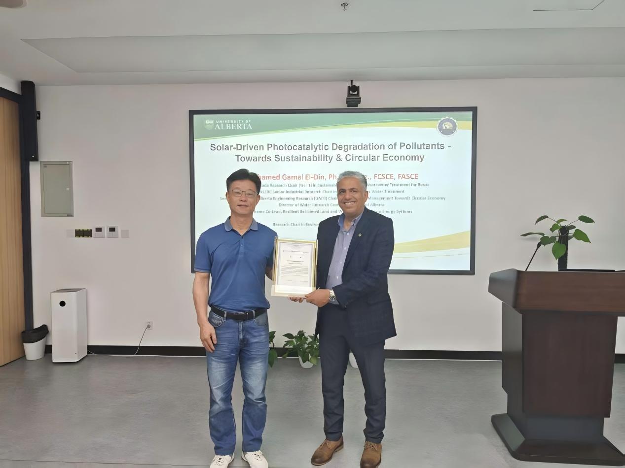 讲座最后,强志民代表学院为Mohamed Gamal El-Din教授颁发了环境讲坛纪念证书并合影留念。