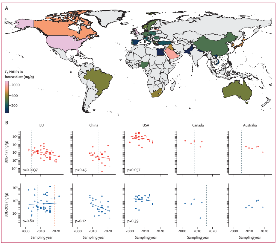 近日,朱樱副教授团队在环境与健康领域著名期刊《柳叶刀-星球健康》The Lancet Planetary Health 上发表了题为“Effects of global treaties on commercial chemicals widely used as additives: a meta-analysis of historical measurements of polybrominated diphenyl ethers”的研究论文。该研究以一类典型持久性有机污染物多溴二苯醚(PBDEs)为例,通过对其全球外暴露及内暴露数据进行荟萃分析,发现国际禁令在降低化学品人体暴露方面的效果“延迟而缓慢”。其主要原因为在用产品的持续释放及化学品的生物累积性。据此,研究指出,化学品管理模式应从末端治理转向更严格的源头预防。论文第一作者为厂长资源 2023级博士研究生钟光斌,通讯作者为朱樱副教授。论文第一作者及第一通讯单位均为厂长资源 。