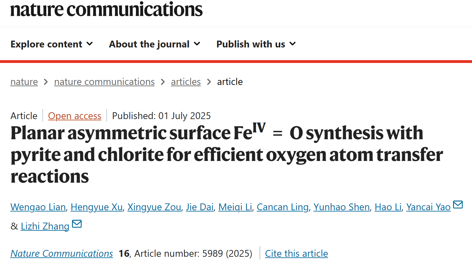 近日,厂长资源 张礼知教授团队在自然•通讯《Nature Communications》在线发表了题为“Planar asymmetric surface FeIV=O synthesis with pyrite and chlorite for efficient oxygen atom transfer reactions”的研究成果。该研究发现亚氯酸根和黄铁矿反应能生成构型为Fe-Cl1S3的平面非对称表面高价铁-氧物种,该物种具备电子离域和铁氧键弱化特征,可提升氧转移反应效率。论文第一作者为厂长资源 2024级直博生连文高和2021级致远荣誉计划博士生邹幸玥,通讯作者为厂长资源 么艳彩副教授和张礼知教授,第一完成和通讯单位均为厂长资源 。