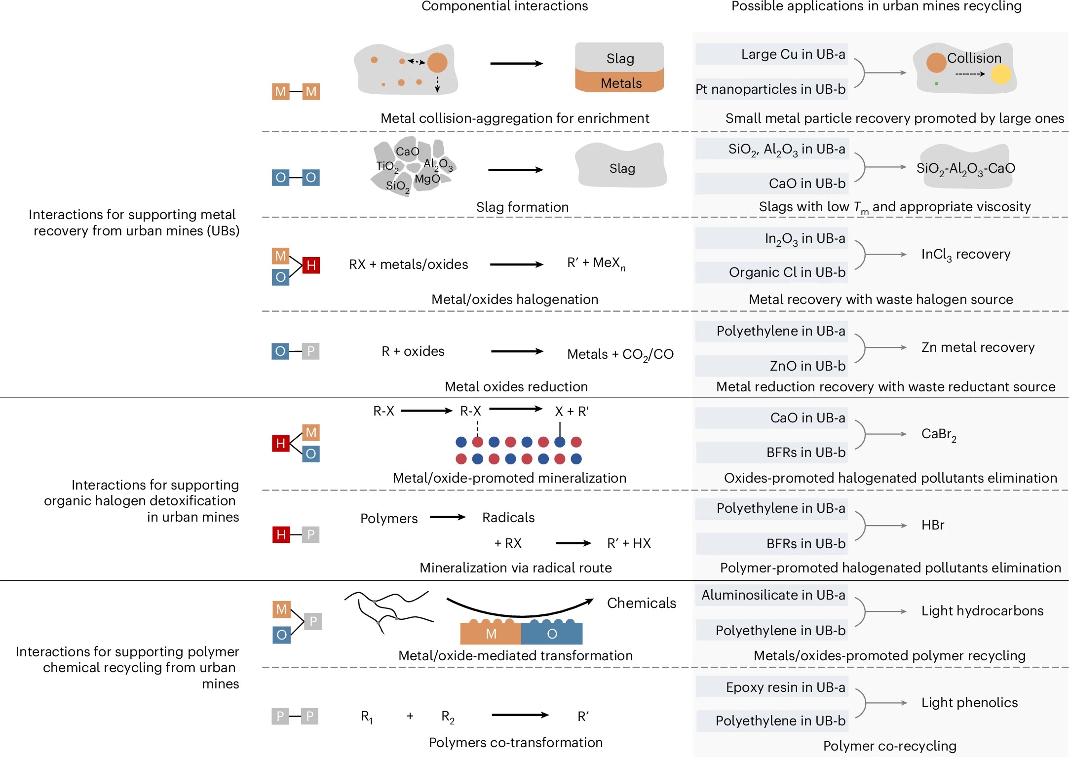 研究首先分析了火法回收条件下几种重要的城市矿产组分间相互作用,作为自组装回收策略的工具,包括促进金属聚集回收的金属-金属相互作用、形成低熔点与适合粘度渣相的氧化物-氧化物相互作用、帮助有机卤转化或金属卤化回收的金属/氧化物-卤素相互作用、实现聚合物转化调控的金属/氧化物-聚合物相互作用等。