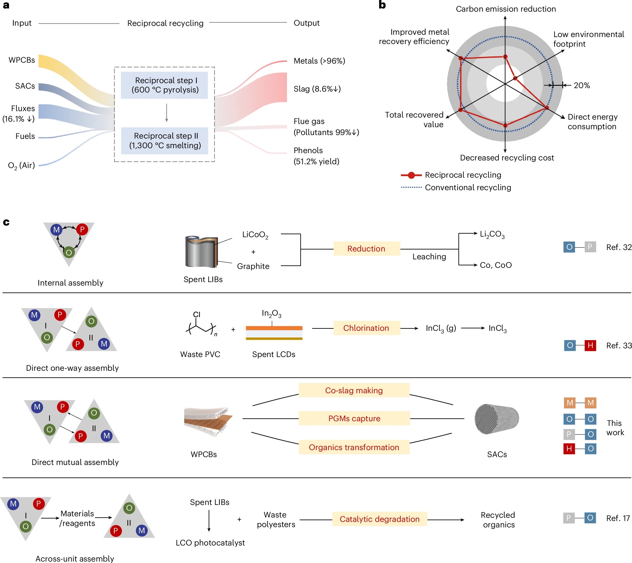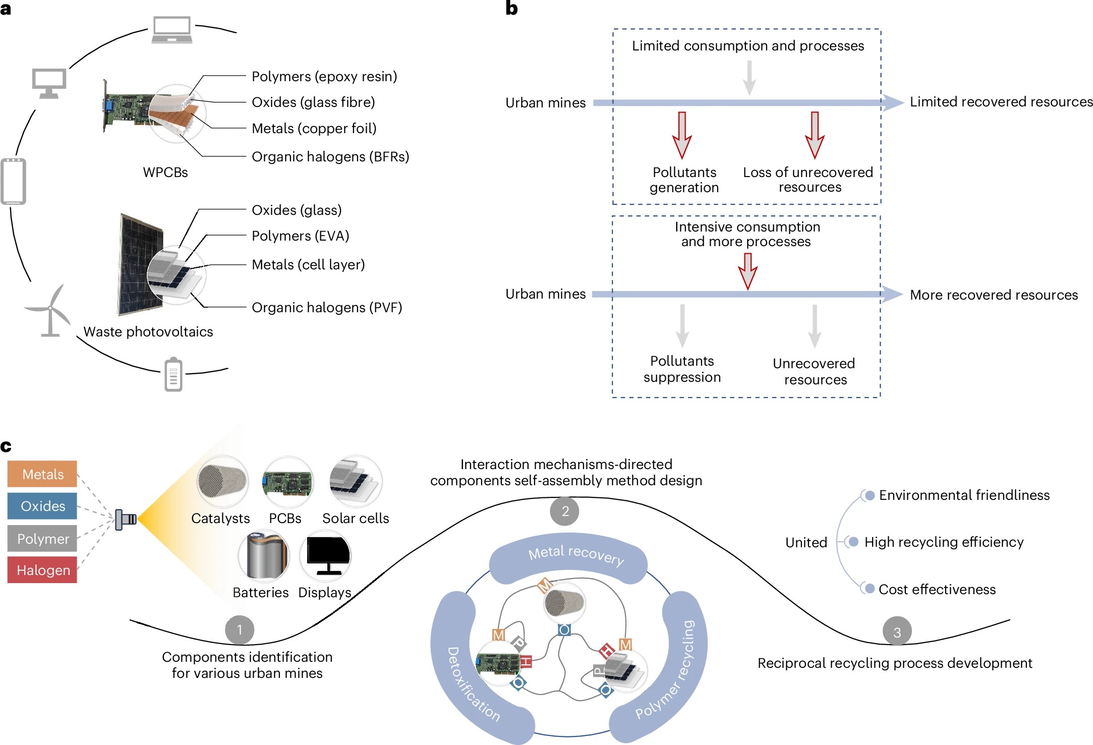 城市矿产是重要的二次资源,包含各种金属、氧化物、聚合物及卤素等多组分,其回收过程面临环境-经济-回收效率挑战。本研究利用城市矿产的组分多样性,提出了城市矿产组分自组装回收策略,减少物质消耗(火法熔炼造渣剂、化学试剂等),实现了一个工艺同时回收与处理多种城市矿产类固废,助力城市矿产资源的可持续循环利用。研究筛选了多种可用于多金属回收、卤化污染物解毒和聚合物转化的组分间物理化学相互作用,并基于四种基础组分相互作用展示了典型组分自组装互惠回收的案例。该策略实现了>96%的铜-铂-钯-铑回收率、>99%溴化污染物抑制率以及环氧树脂的热转化调控。自组装互惠回收策略展现出环境-经济-效率的协同效益与高度灵活性,为可持续城市矿产开采和材料循环利用提供了新路径。