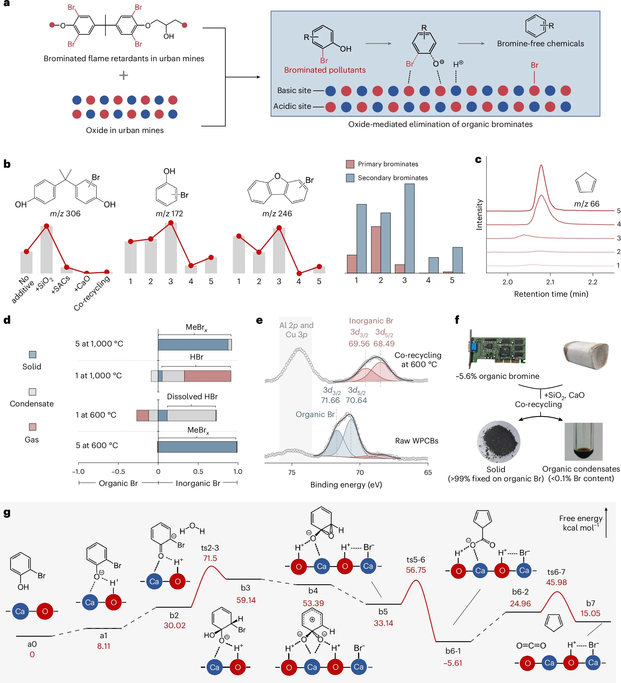 基于各种组分相互作用,以废电路板与汽车废催化剂互惠回收为典型案例,研究组分自组装行为、机制及效果。废电路板中溴化阻燃剂主要以反应型四溴双酚A存在于环氧树脂分子链中,少量为添加型多溴联苯醚等。在热解等高温处理过程中容易产生持久性、毒性溴化有机污染物,包括多溴代二噁英等剧毒物质,金属氧化物或氢氧化物能够在热解过程中促进有机溴无机化。研究表明,废电路板与废催化剂互惠回收过程中氧化物组分有效抑制溴化污染物生成,能够将超99%的溴以无机态固定于渣相,CaO组分是唯一能够促进有机溴矿化的有效组分。进一步研究揭示了两种CaO促进有机溴转化的可能路径。