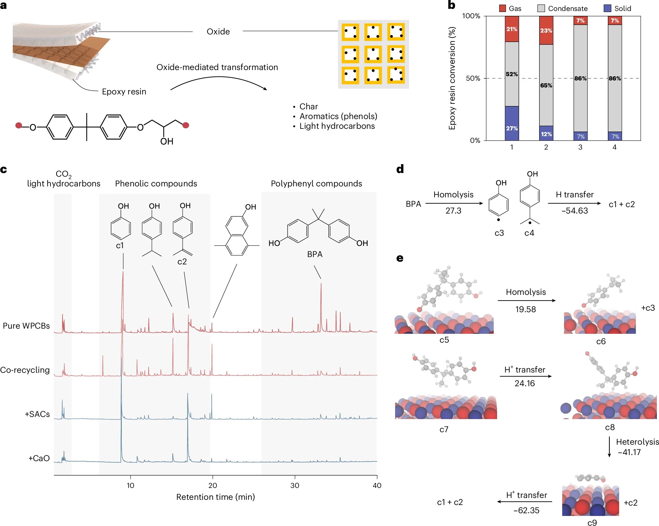 废电路板与汽车废催化剂互惠回收过程中,环氧树脂在溴化污染物消除的同时也发生热分解。共存组分对树脂转化的调控作用为将其转化为潜在有用的化学原料提供手段。在还原氛围下,环氧树脂的热分解会生成酚类、轻质烃、焦炭以及多环芳烃。互惠回收相比于单独回收生成更多小分子酚类化合物,产物更加集中,苯酚及4-异丙烯基苯酚的选择性高。热裂解-GC/MS分析表明CaO和汽车废催化剂在600℃下均促进了双酚A分解为苯酚和4-异丙烯基苯酚,结合DFT计算分析了CaO表面双酚A分解的潜在路径。