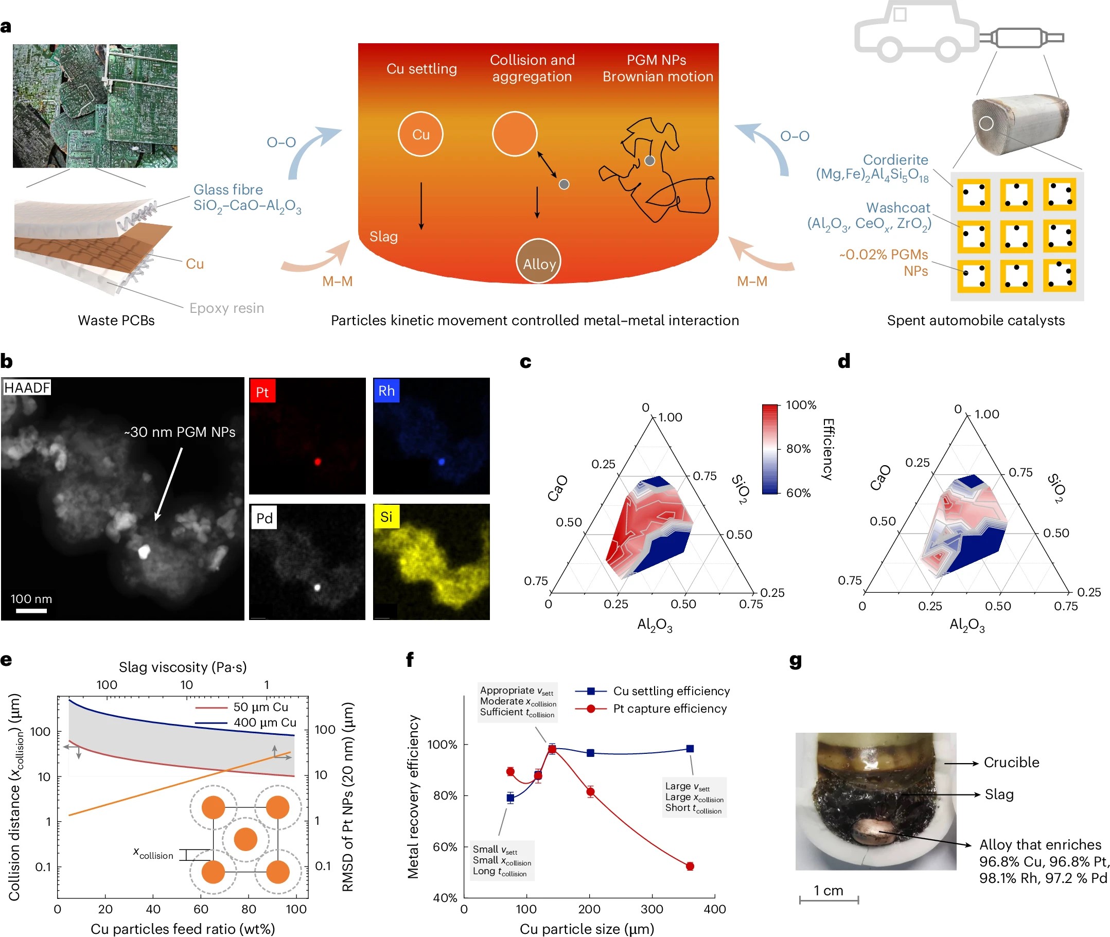 城市矿产中高度分散金属(如破碎后汽车废催化剂中铂族金属呈纳米颗粒状)的回收依赖添加金属捕集剂进行熔炼富集,其过程需要形成合适熔渣相。例如采用铜作为金属捕集剂熔炼富集汽车废催化剂中铂族金属,其过程中铜熔体液滴在熔渣中主要以沉降运动为主,铂族金属纳米颗粒主要以无规则布朗运动为主,铂族金属回收需要其与铜熔体液滴间的有效碰撞和铜液滴的完全沉降。通过调控互惠回收过程中氧化物组分比例形成合适渣相、废电路板中铜粒径与添加量、熔炼温度等条件,促进有效碰撞与沉降,铜、铂、铑、钯富集回收率分别达到96.8%、96.8%、98.1%、97.1%。
