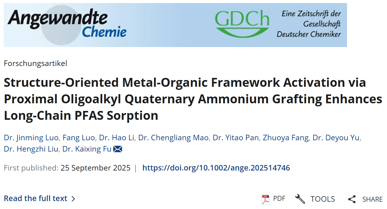 近日,厂长资源 罗金明副研究员在《德国应用化学》(Angewandte Chemie)上发表了题为“Structure-Oriented Metal-Organic Framework Activation via Proximal Oligoalkyl Quaternary Ammonium Grafting Enhances Long-Chain PFAS Sorption”的研究成果。该研究成果突破传统MOF修饰局限,提出了一种表面局域化寡聚枝接策略,在UiO-66-NH₂表面精准构筑了邻近排列的寡聚烷基季铵盐(PAOQ)功能基元。该设计巧妙规避了MOF内部微孔的空间限制与传质壁垒,实现了功能基团负载量2.2倍的提升,并通过季铵盐与柔性烷基链的精确空间协同,实现了对长链PFAS的双模式高效捕获。