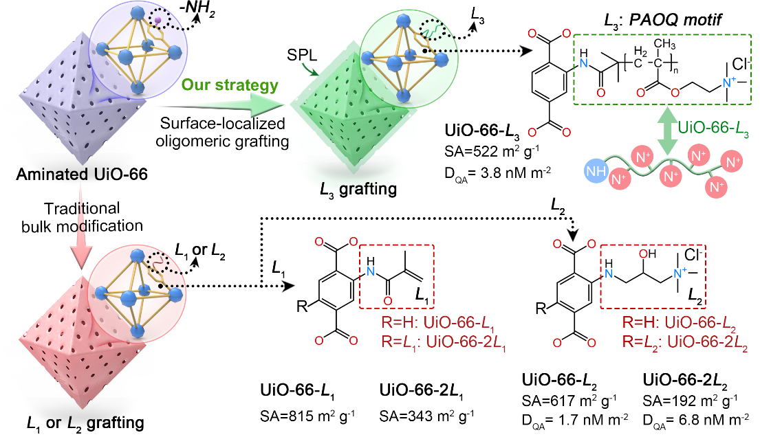 金属有机框架材料(MOF)因其比表面积大、结构可调,被广泛用于PFAS去除。然而,MOF材料微孔功能化受限、配位位点不足以及主客体相互作用力较弱,限制了其规模化应用。鉴于此,研究团队提出一种表面定位寡聚接枝新策略,在UiO-66-NH2骨架上构建近端排列的低聚烷基季铵(PAOQ)功能基元,成功开发出新型吸附材料UiO-66-L3。实验表明,UiO-66-L3具备快速吸附动力学(5分钟达到平衡)和高吸附容量(403–1872 mg·g⁻¹),性能优于常见季铵化材料13.3倍。理论模拟进一步揭示,低聚烷基链可增强相邻铵位点的静电势,赋予材料链长依赖性选择能力。该研究不仅展示了表面化学调控对Zr-MOF性能提升的关键作用,也为设计高性能PFAS吸附材料提供了新方向。