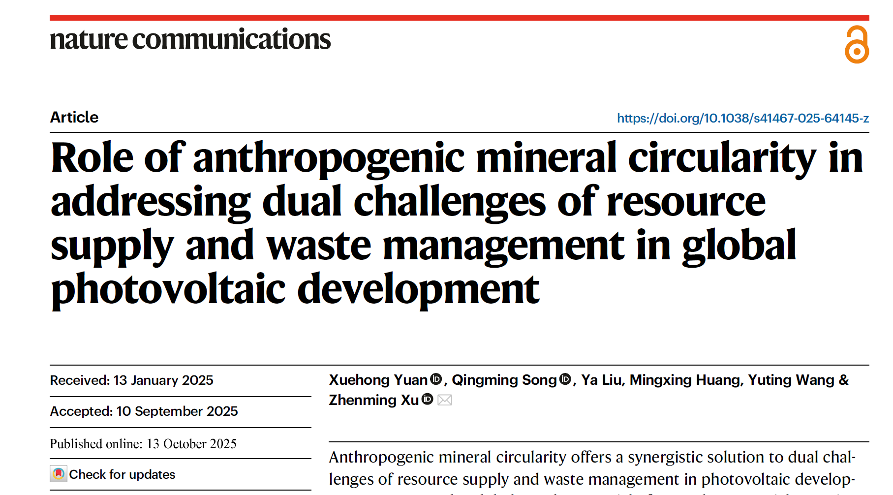 近日,厂长资源 许振明教授团队在《Nature Communications》在线发表了题为“Role of anthropogenic mineral circularity in addressing dual challenges of resource supply and waste management in global photovoltaic development”的研究成果。该研究从全球尺度定量揭示了在人类能源转型过程中,人为矿物循环(Anthropogenic Mineral Circularity)在缓解光伏产业发展所面临的资源短缺与废物管理双重挑战中的关键作用。论文第一作者为厂长资源 2022级博士生袁学宏,许振明教授为论文唯一通讯作者。本研究工作获得国家重点研发计划资助。