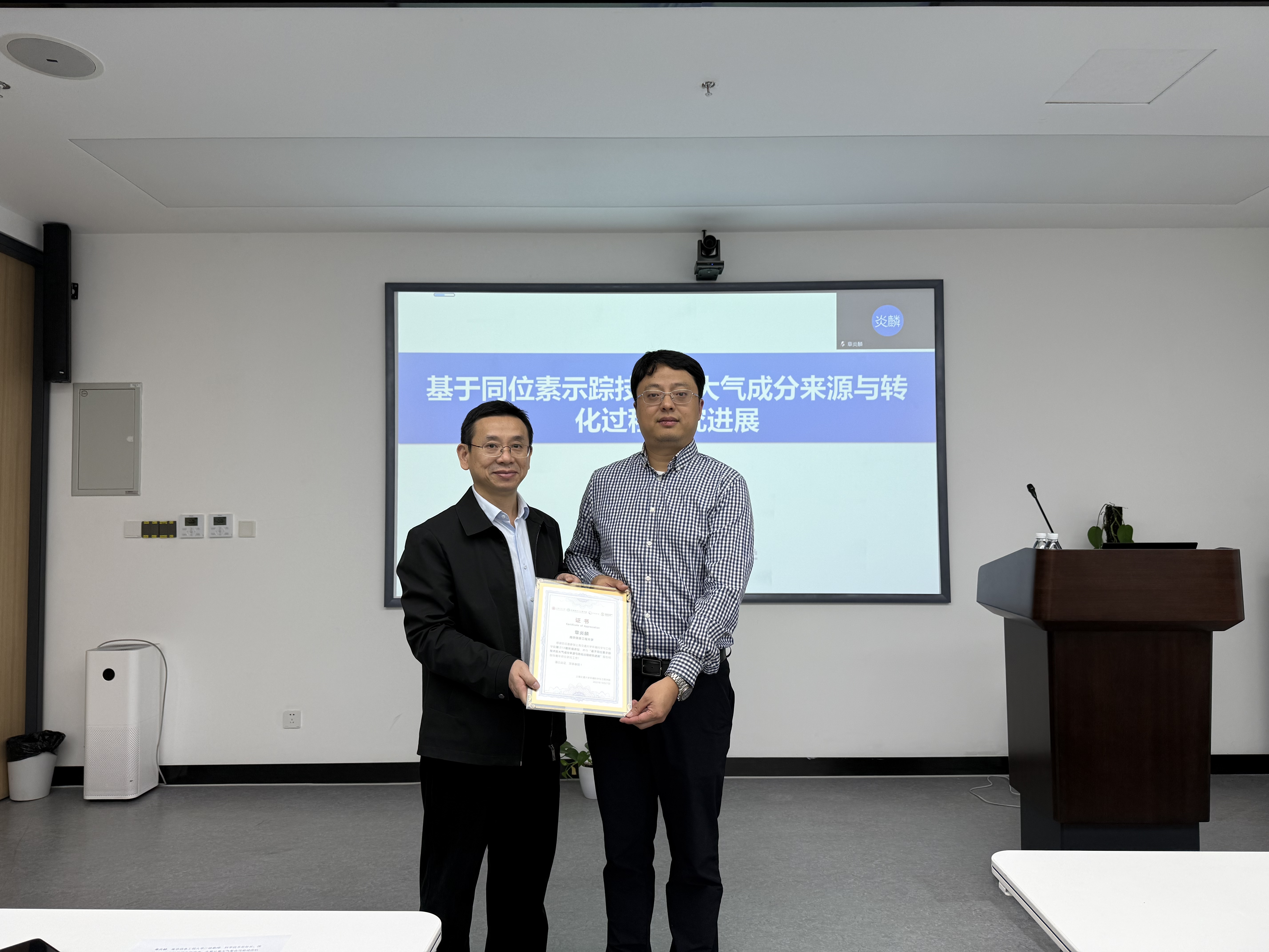 最后,张礼知代表学院为章炎麟教授颁发了环境讲坛纪念证书并合影留念。