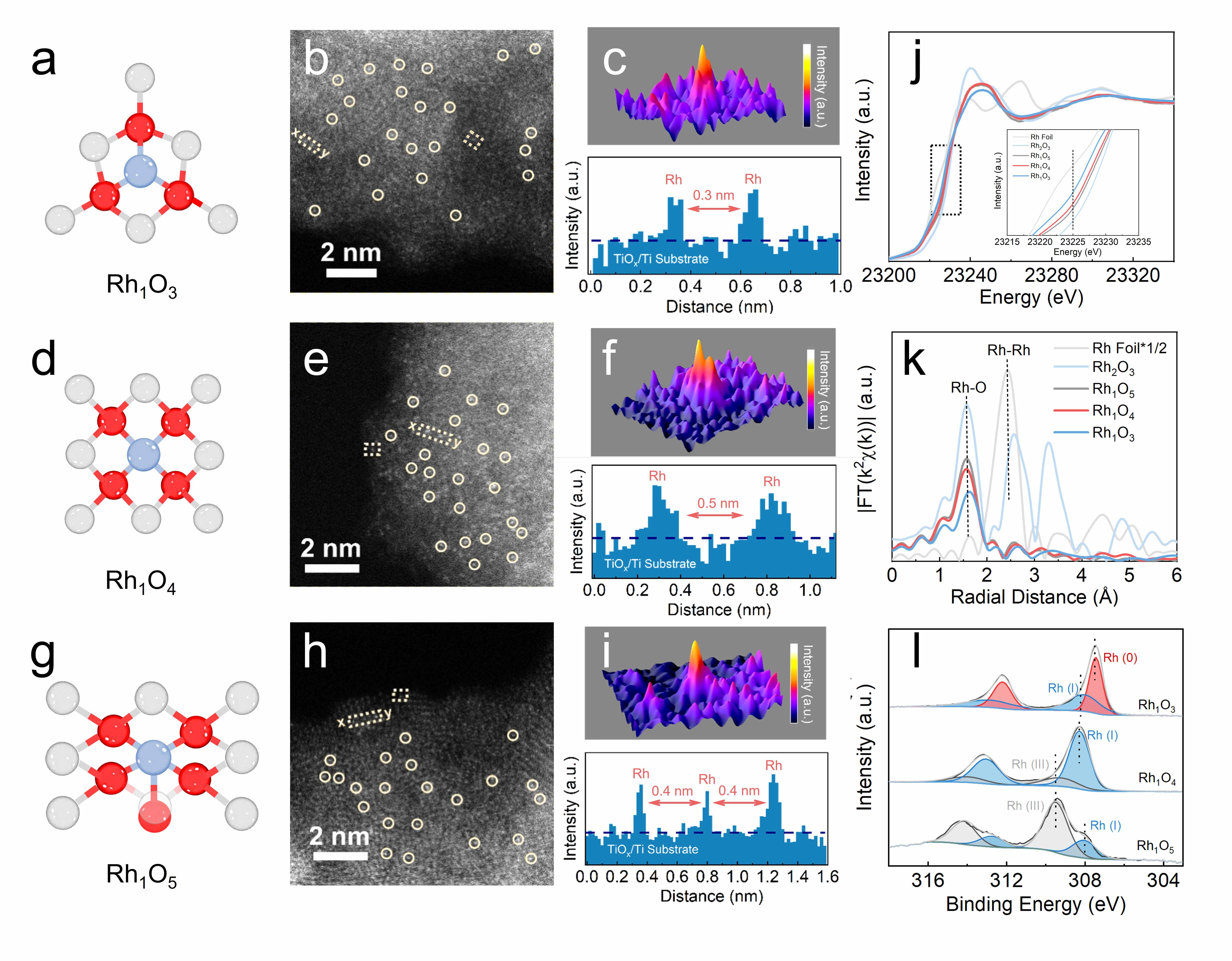 本工作在前期单原子反向氢溢流的研究基础上(Angew. Chem. Int. Ed. 2024, 63, e202401386),通过调控煅烧温度和气氛,制备了具有不同Rh-O配位环境的钛基Rh单原子电极材料(记为Rh1Ox,x = 3、4、5)。