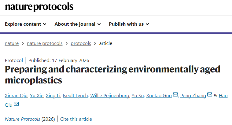 仇浩教授联合西北农林科技大学郭学涛教授、中国科学技术大学张鹏教授组成的国家重点研发计划青年科学家项目团队在《Nature Protocols》发表的论文“Preparing and characterizing environmentally aged microplastics”,首次提出了一套标准化、模块化、可量化的微塑料老化研究系统解决方案。
