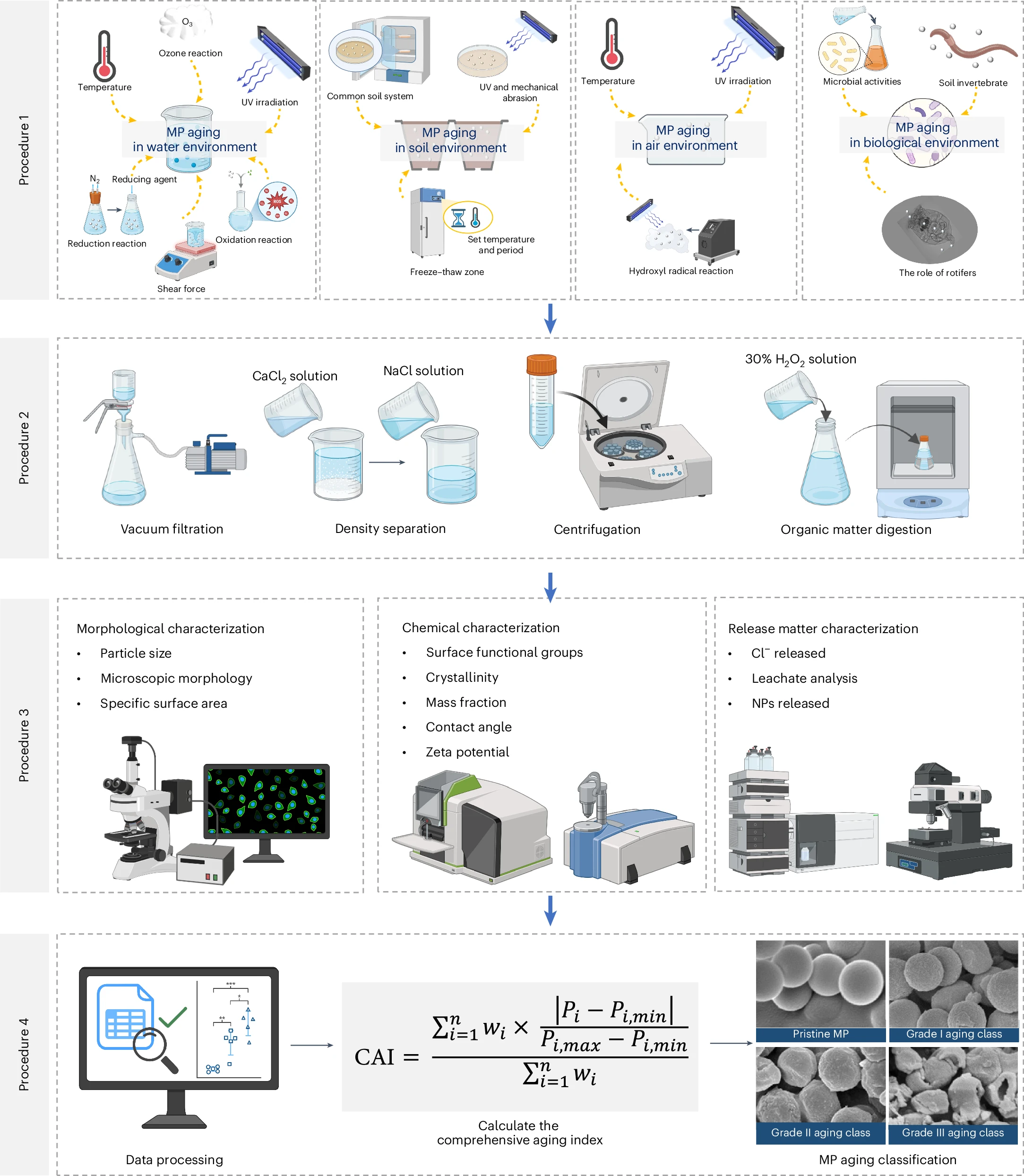 研究整合了扫描电镜、红外光谱、热裂解-气相色谱-质谱等11种表征技术,从微观形貌、表面化学、溶解特性、质量变化等多个维度刻画老化程度。更关键的是,团队建立了复合老化指数(CAI),通过加权标准化各指标,将复杂的多维数据转化为一个可比较的量化值,并将老化程度划分为三个等级,首次实现了跨研究、跨环境下老化程度的定量比较。