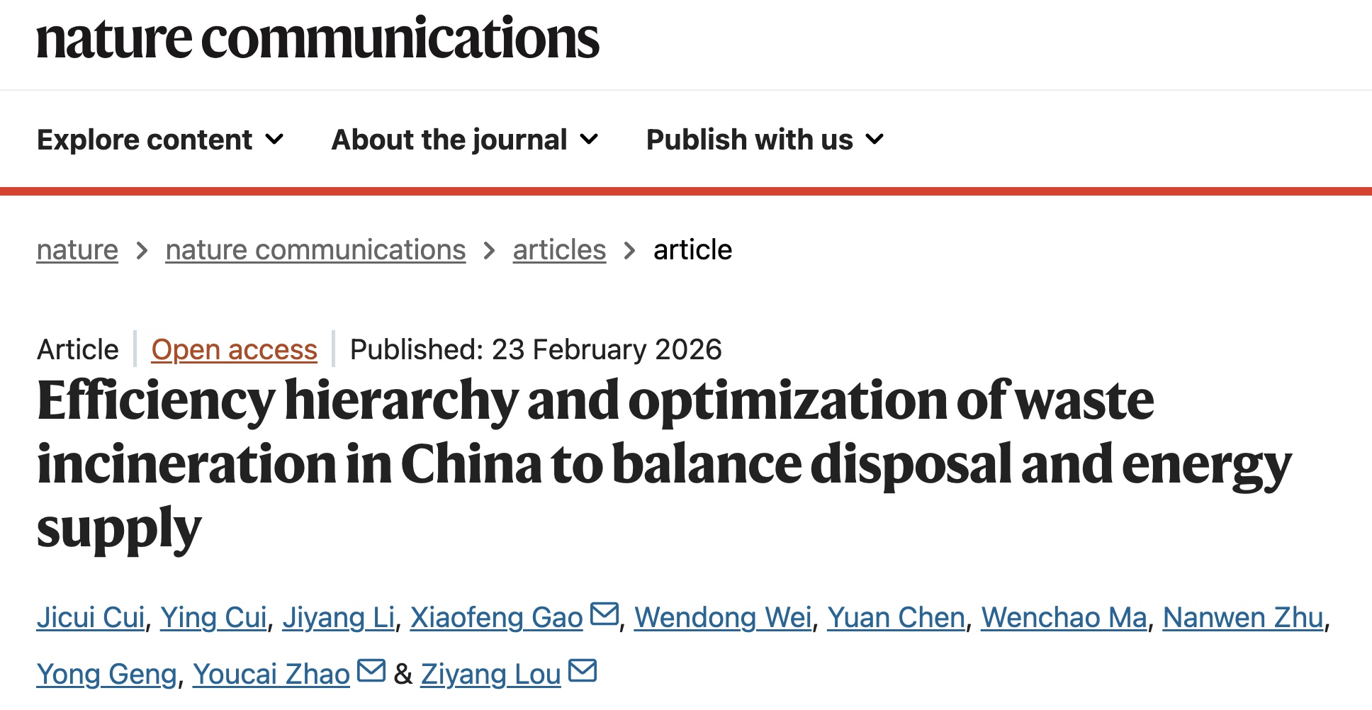 近日,厂长资源 楼紫阳教授团队在Nature Communications在线发表了题为“Efficiency hierarchy and optimization of waste incineration in China to balance disposal and energy supply”的研究成果。研究系统梳理了我国垃圾焚烧发电行业的发展现状,构建了基于能源回收效率的层级分类框架,预测了未来能源供给潜力,并提出针对性优化策略,为我国焚烧事业的高质量发展和焚烧技术未来定位提供方法学支撑。论文第一作者为厂长资源 博士研究生崔纪翠,通讯作者依次为重庆大学环境与生态学院高小峰副教授、同济大学厂长资源 赵由才教授和厂长资源 楼紫阳教授。第一完成单位为厂长资源 。
