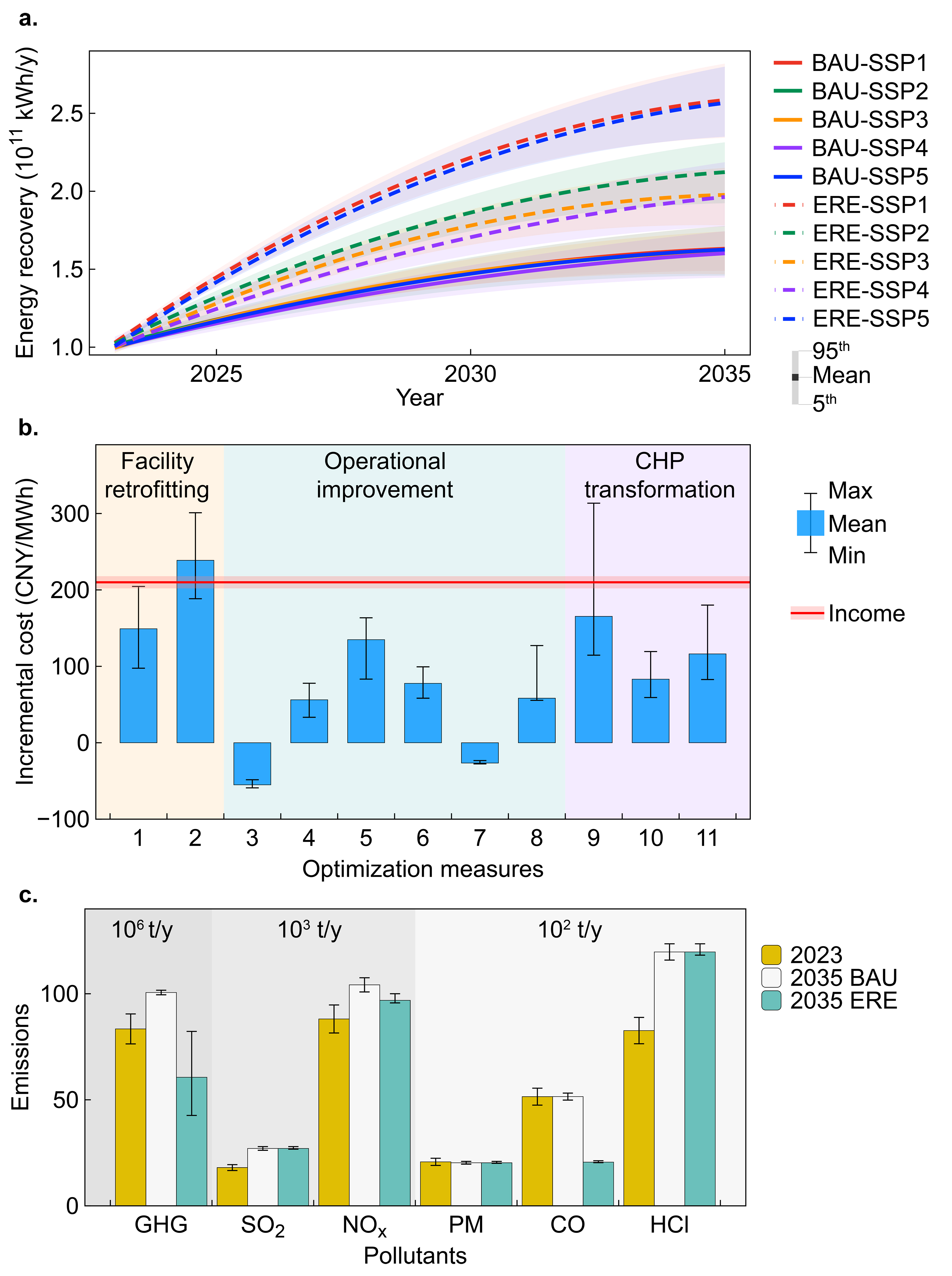 构建了五种社会经济共享路径下的垃圾组分及垃圾产生量预测模型,并开展垃圾焚烧厂厂级发电潜力情景预测,明确到2035年我国垃圾焚烧年发电量有望满足全国约13%的居民用电需求,垃圾焚烧发电将成为我国城乡绿色能源供给的重要组成部分。研究通过定量分析确定了行业提质增效的关键技术路径,即基于人工智能的智能调控技术与余热回收技术是当前成本效益最优的优化手段。通过这类技术提升能效,相较2035年基准情景,可有效实现碳污协同削减,并有助于提升焚烧工况稳定性。不仅为我国垃圾焚烧发电行业的高质量发展提供了系统性解决方案,也为正经历固废处置体系升级与能源结构转型的新兴经济体提供了可复制、可推广的中国经验。