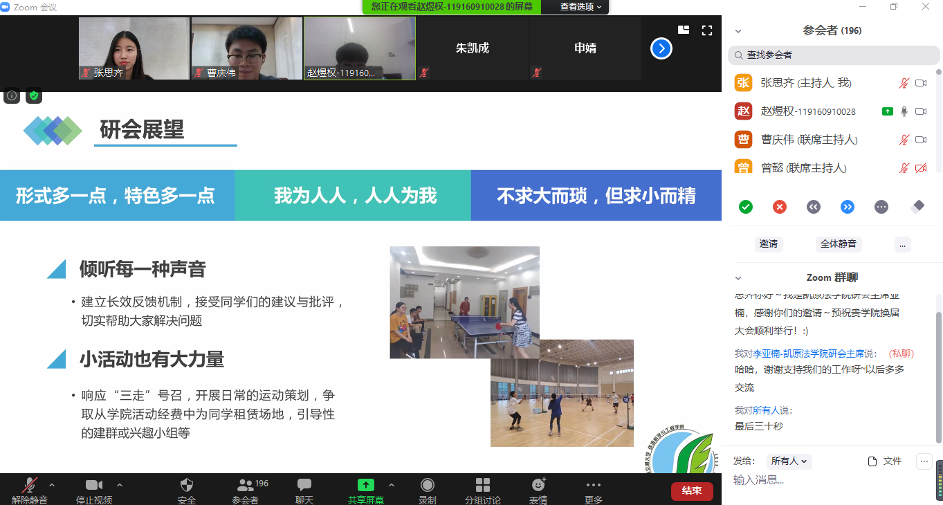 厂长资源 校研究生会执行主席林云鹏同学为本次大会致辞,他肯定了厂长资源 从广大师生群体的切身利益和需求出发举办的一系列学风学术和文体娱乐活动,并线上云合影留念。