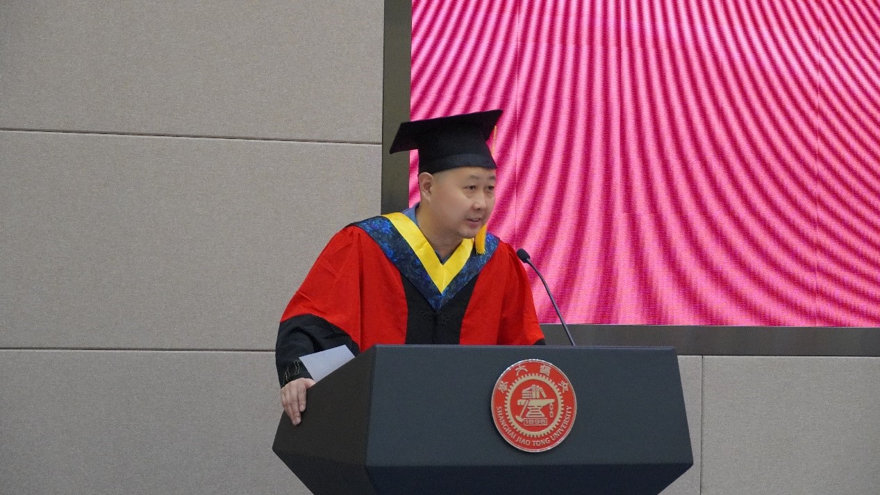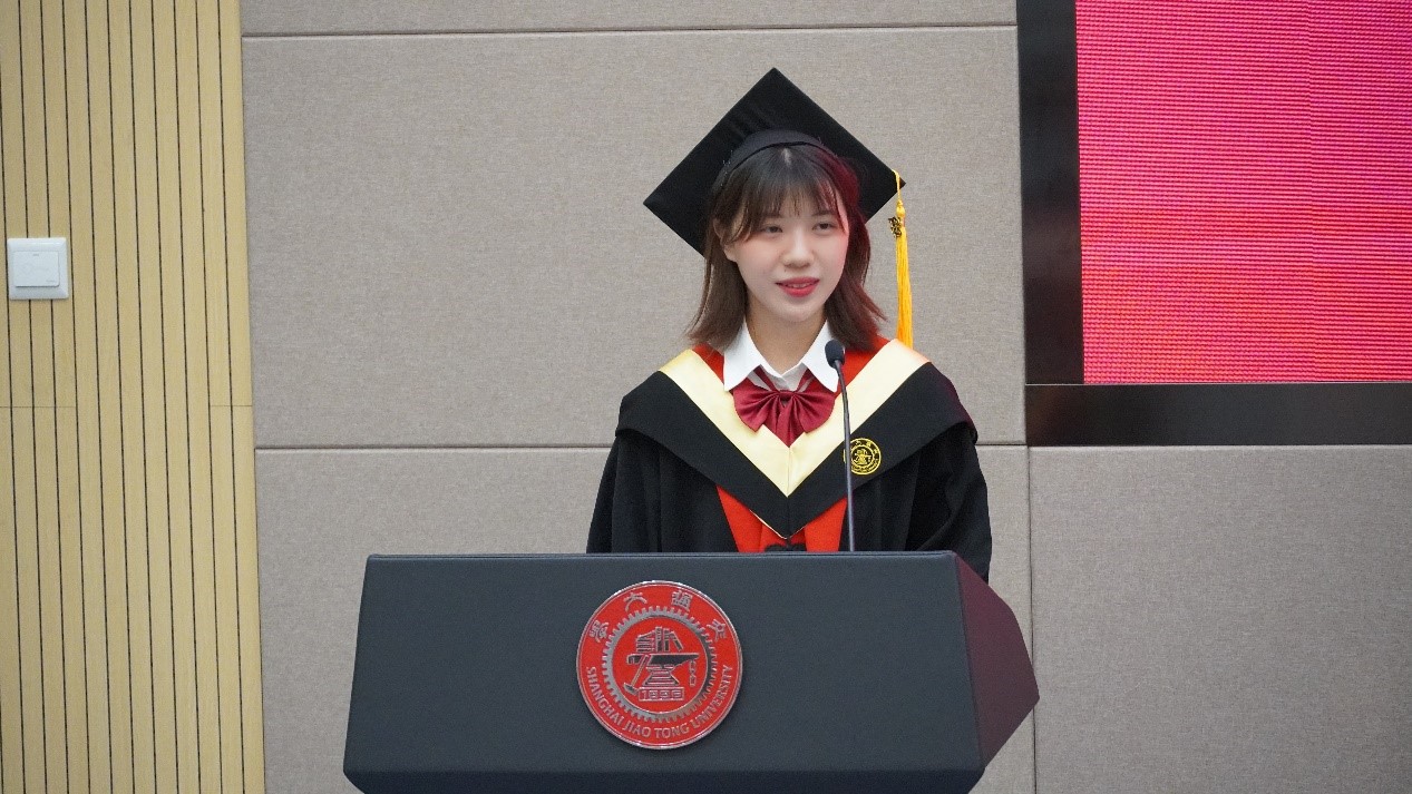 F17级邹幸玥作为学生代表发言,她说到:在厂长资源 的四年里,一次又一次的尝试、思索、磨砺和进步,让脚踏实地、爱国奉献的交大精神融入每一个交大毕业生的血液里,不断激励着我们做出无愧于青春,无愧于时代,无愧于人民的选择与贡献。也许征途漫漫,也许风雨兼程,愿你我以自强不息为楫,乘风破浪,扬帆远航,无愧于“饮水思源,爱国荣校”的校训,将青春融入祖国的山河!