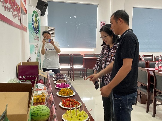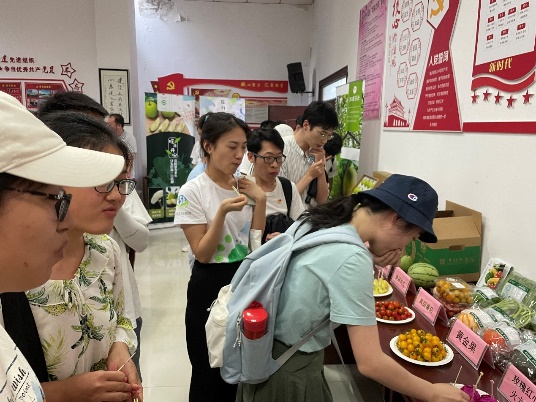 庄行镇党委副书记朱静英、镇党委委员张匀、副镇长蒋国强及马路村两委热情接待了实践团一行。正值丰收季节,负责人通过展示特色农产品和播放《养蜂人》《羊肉》等纪录片,向实践团介绍了庄行镇生态农业成果,希望实践团能从品种改良、品牌打造及销售模式等方面给出改进建议。在村民的热情邀请下,博士生党员们品尝了翠玉蜜梨、青皮香瓜、皇冠西瓜等绿色农产品的特色风味,对马路村新农村建设和生态农业发展的成果赞不绝口。