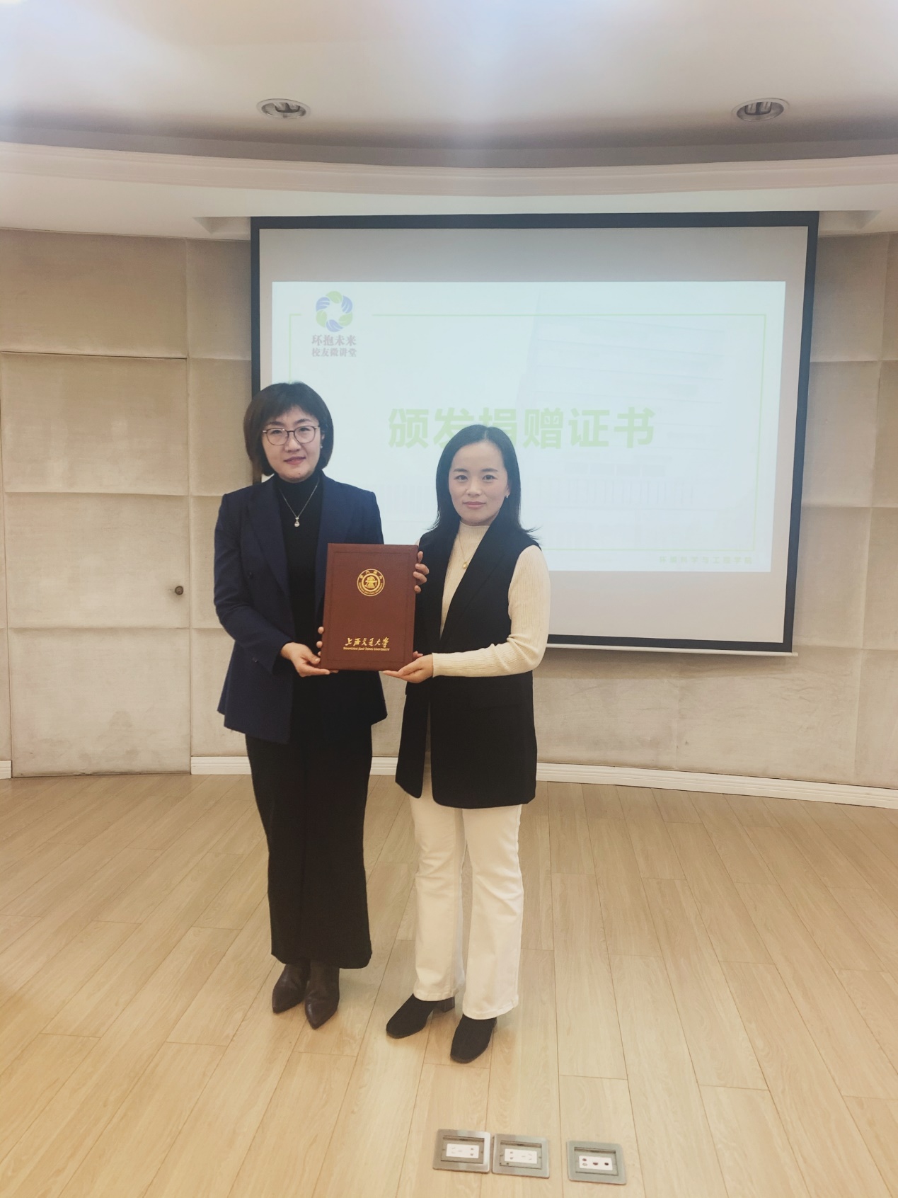 为支持学院新大楼建设,高利利向学院赠送十套实验室应急处理套件包,张洋代表学院颁发捐赠证书。