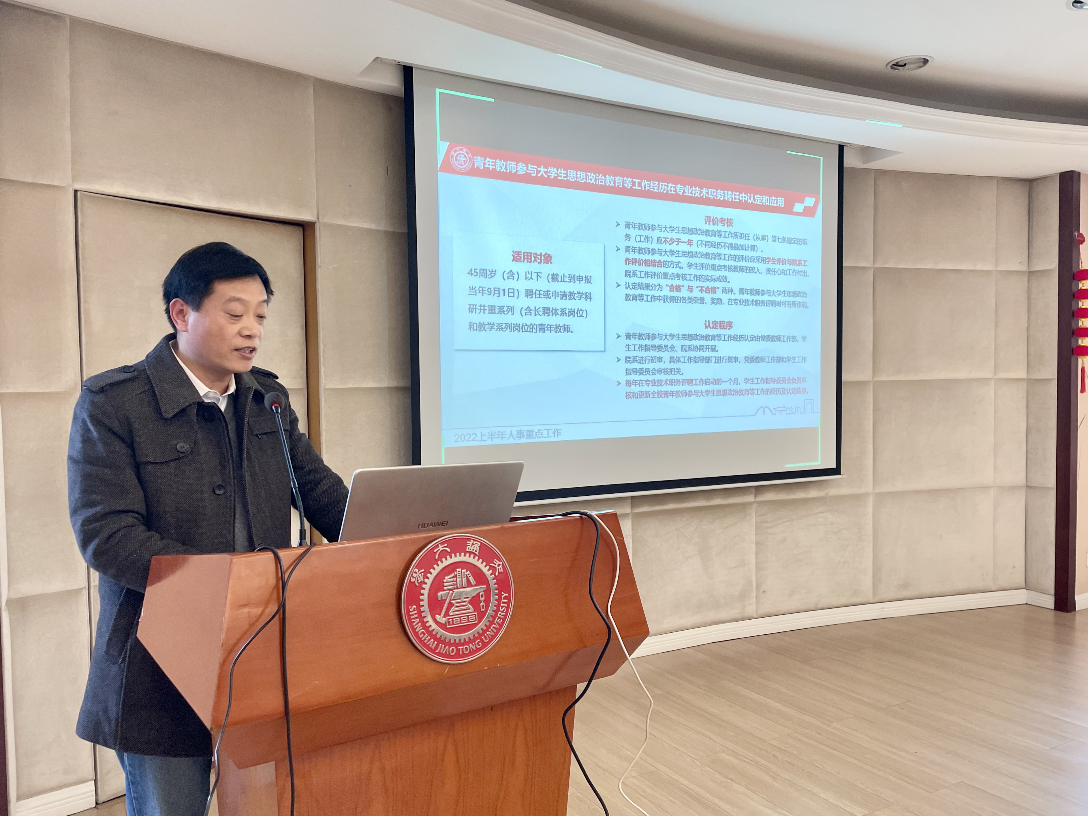 副书记何圣兵就人事工作进行要点介绍。他细致讲解了海外优青、长聘教轨、优秀青年教师破格聘任等申报条件,并强调学院将进一步推动落实人事档案专项审核工作,希望各位老师高度重视、积极配合。