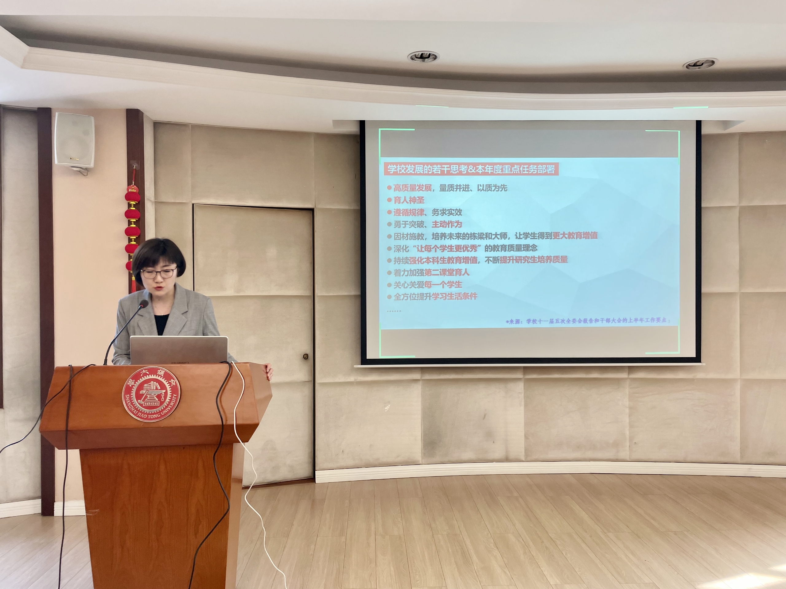 副院长刘萍介绍了春夏学期教学工作安排,对新一轮本科教学思想大讨论、学位点合格评估、课程质量提升与课程专业评教等重点工作予以部署。